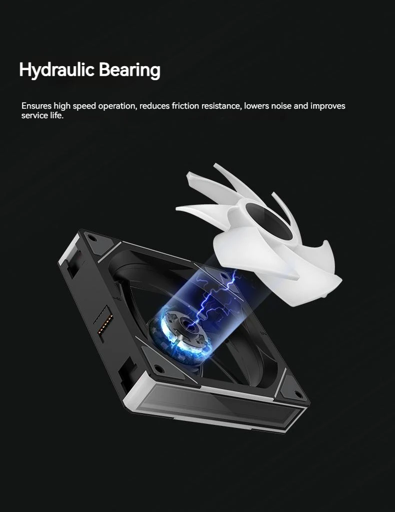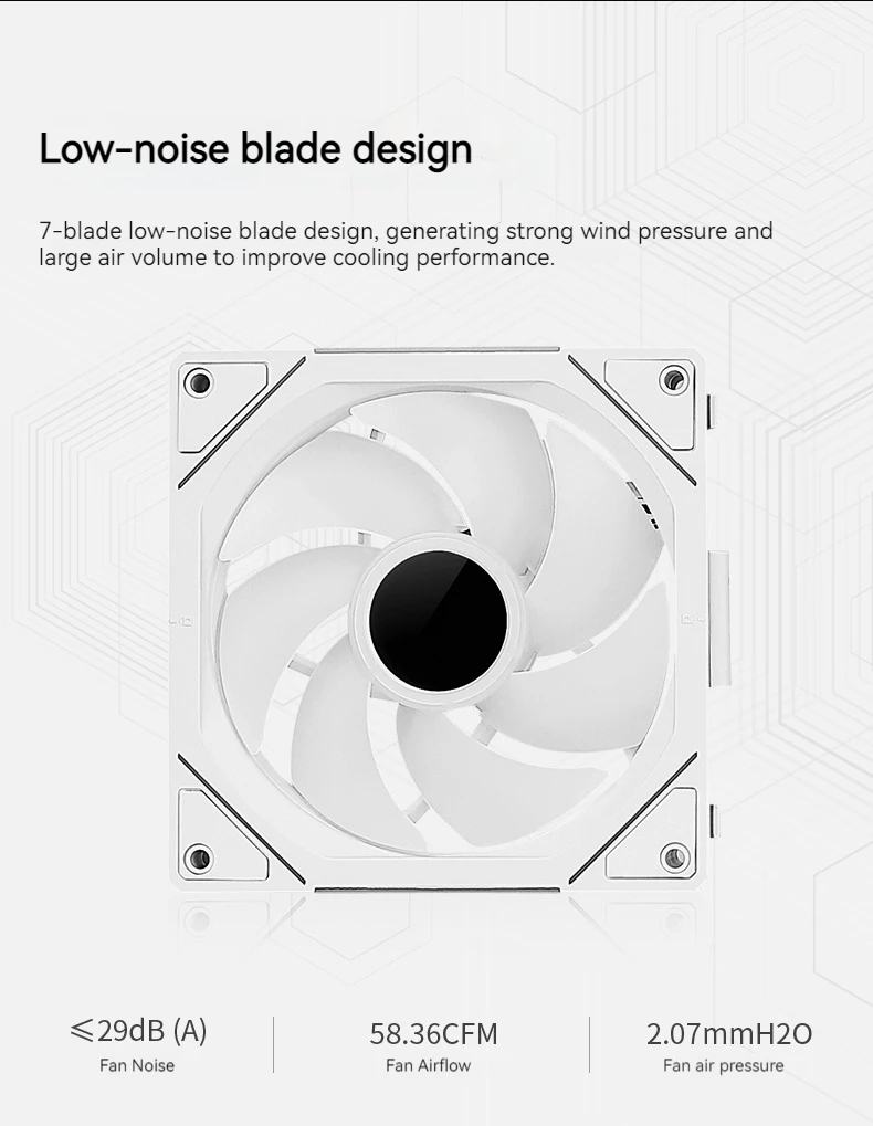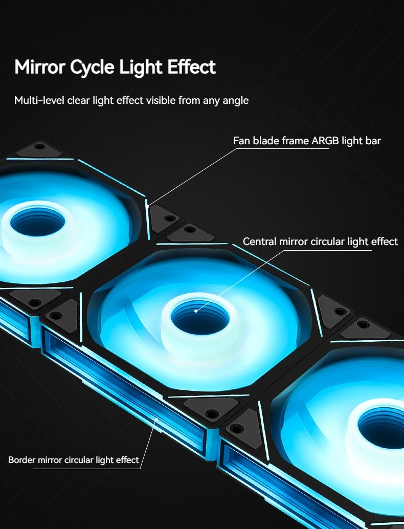 O ventilador e a moldura usam 8 + 16 contas de lâmpada ARGB, e um efeito de luz de anel de espelho é adicionado às molduras superior e inferior e ao centro do ventilador, o que é adequado para sincronização de luz da placa-mãe, o que significa que computadores DIY podem ser mais coloridos!